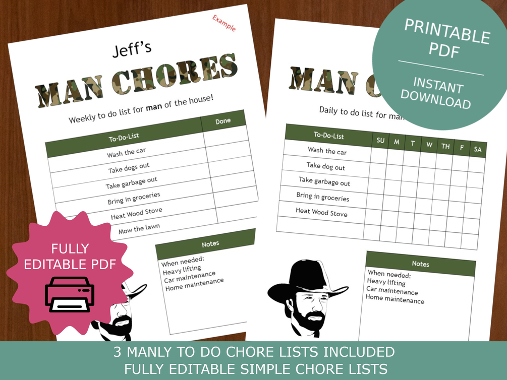 A high quality Chore Chart for Men, Printable Editable PDFs: