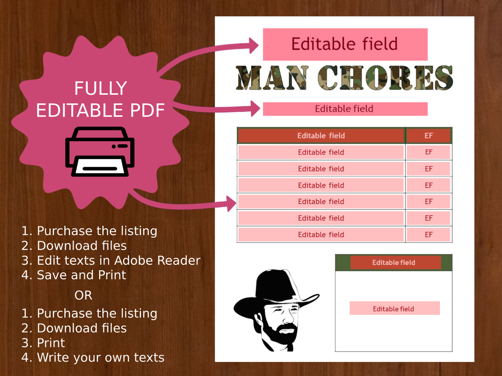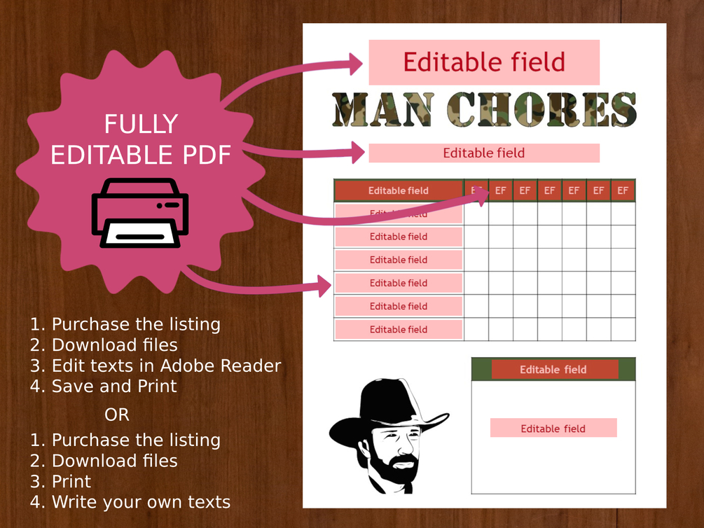 - Everything but the "MAN CHORES" text can be modified with free Adobe Acrobat Reader.