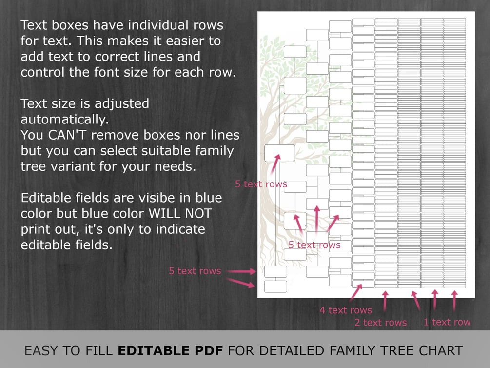 To start, simply open the file, click on the blue field and type the information for each generation. Click on each field to complete the template. Save the file, and print. Make changes as necessary at any time. Note that due to the field sizes, the number of characters may be limited. Font size is adjusted automatically but large amount of text in small field might cause too small font size when being printed.