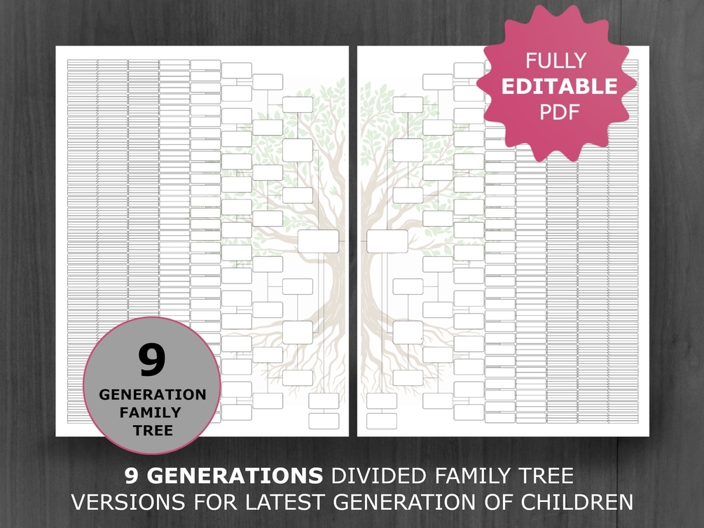 Divided 9 Generation Family Tree Chart with Children: Printable and Editable Genealogy Template (PDF)