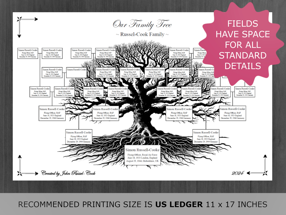 • 1 X Black & White Family Tree with sub-header text (under "Our Family Tree"-text"), year- and signature fields.