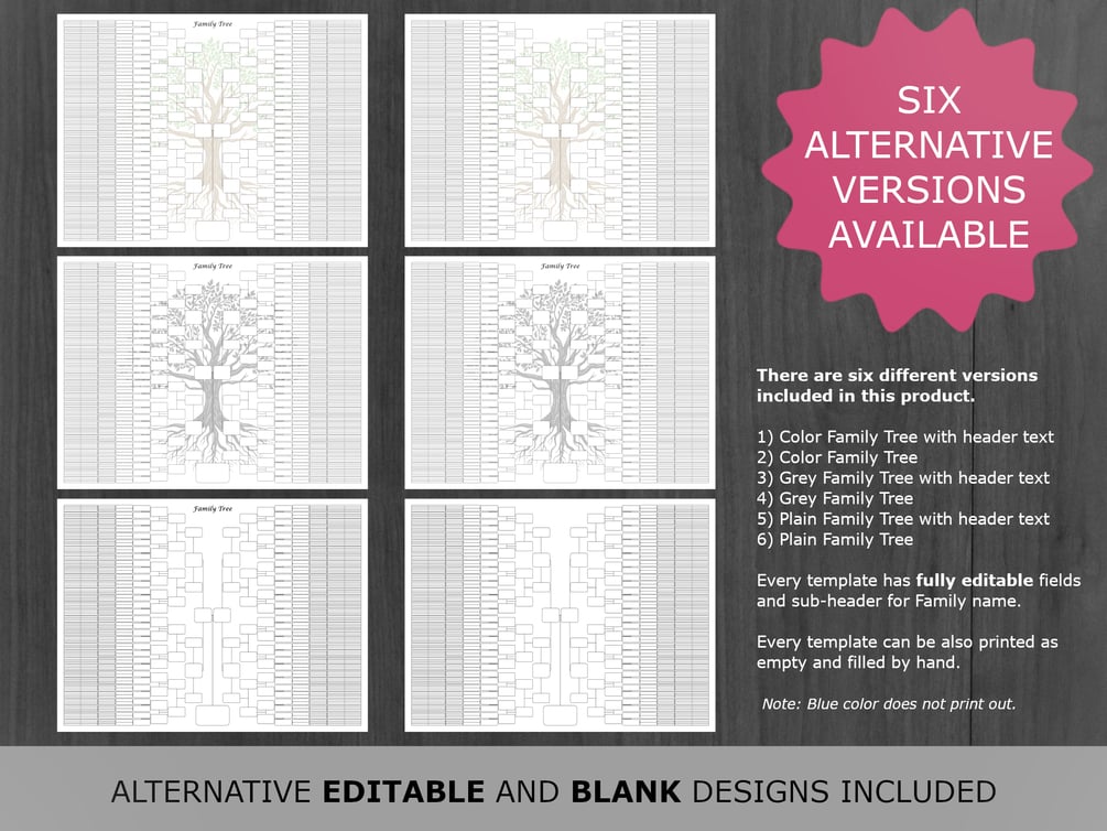 • 1 X Plain Family Tree with "Family Tree"-text", editable custom family name header and editable fields