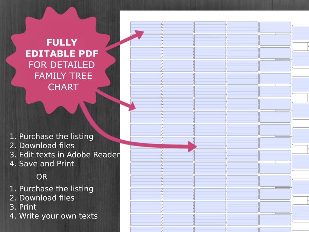 Family Tree Chart or Pedigree Chart is a beautiful and personalized genealogy chart that displays the connections and relationships among ancestors of a focus individual. It can be invaluable for documenting and tracing family history, making it a cherished heirloom within families. It is also a perfect activity or gift in a family reunion. This Family Tree is for Ten Generations and it concentrates on simplicity, standard value fields and structure. It has editable fields meant for e.g. name, occupation, birth- and death dates. Or, simply print them blank and hand write the information in the boxes. You can also add your custom Family name in every template.