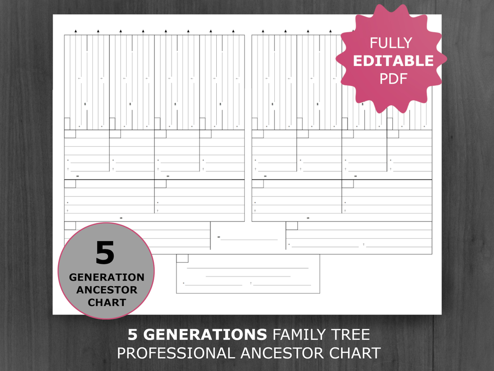 5 Generations Family Tree Chart. Printable and Editable Family Tree Template. Digital Ancestor/Pedigree Chart. Ancestral Genealogy Template.