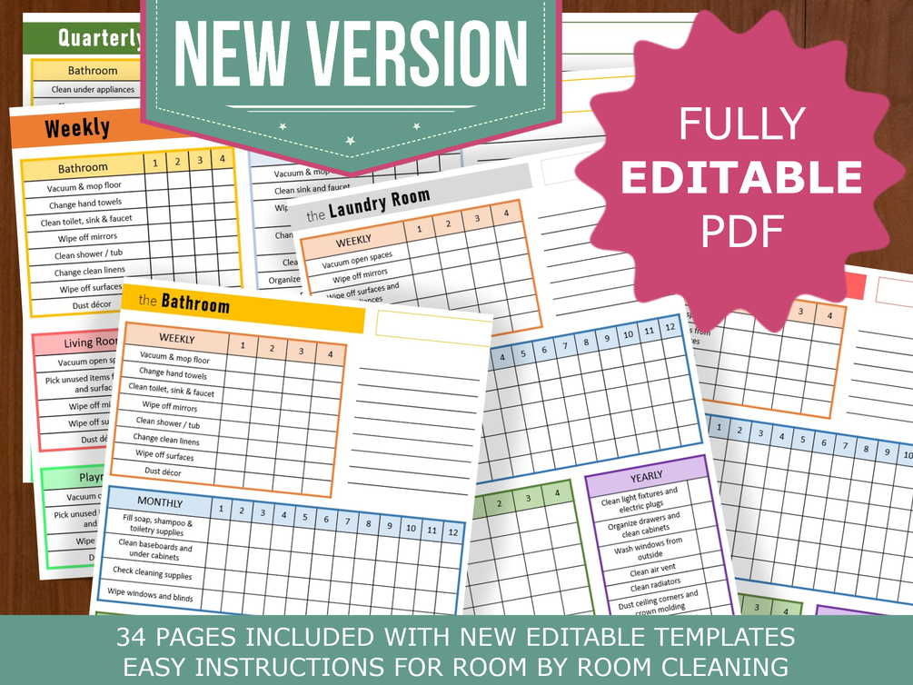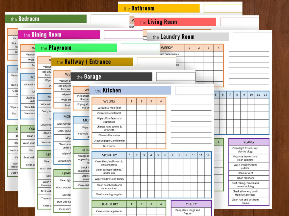• Empty editable Weekly, Monthly (2 pc), Quarterly and Yearly cleaning checklists for each room