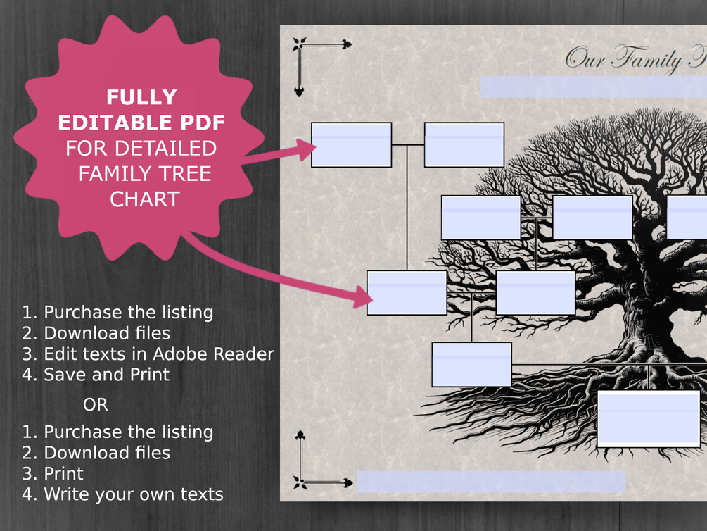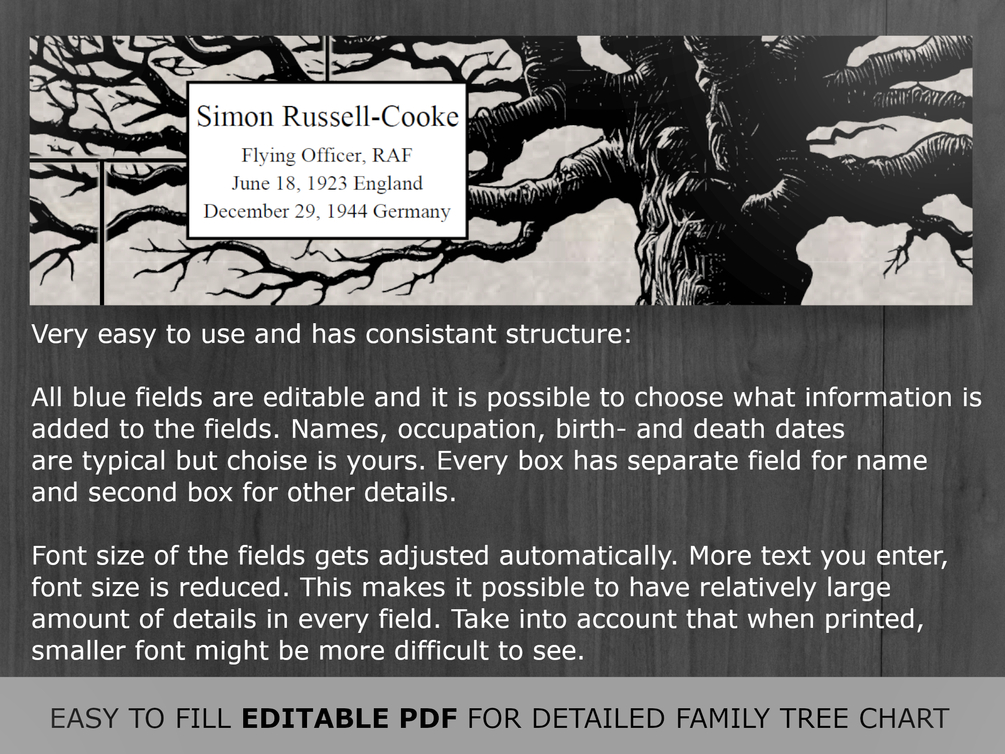 Every box has two editable fields meant for name and other details of your choosing. Edit with computer (Adobe Reader recommended), or simply print them out blank and hand write the information in the boxes. You can also add your custom Family name under the "Our Family Tree" -text. All field values are editable (marked with blue). The boxes, lines and pictures are not editable.