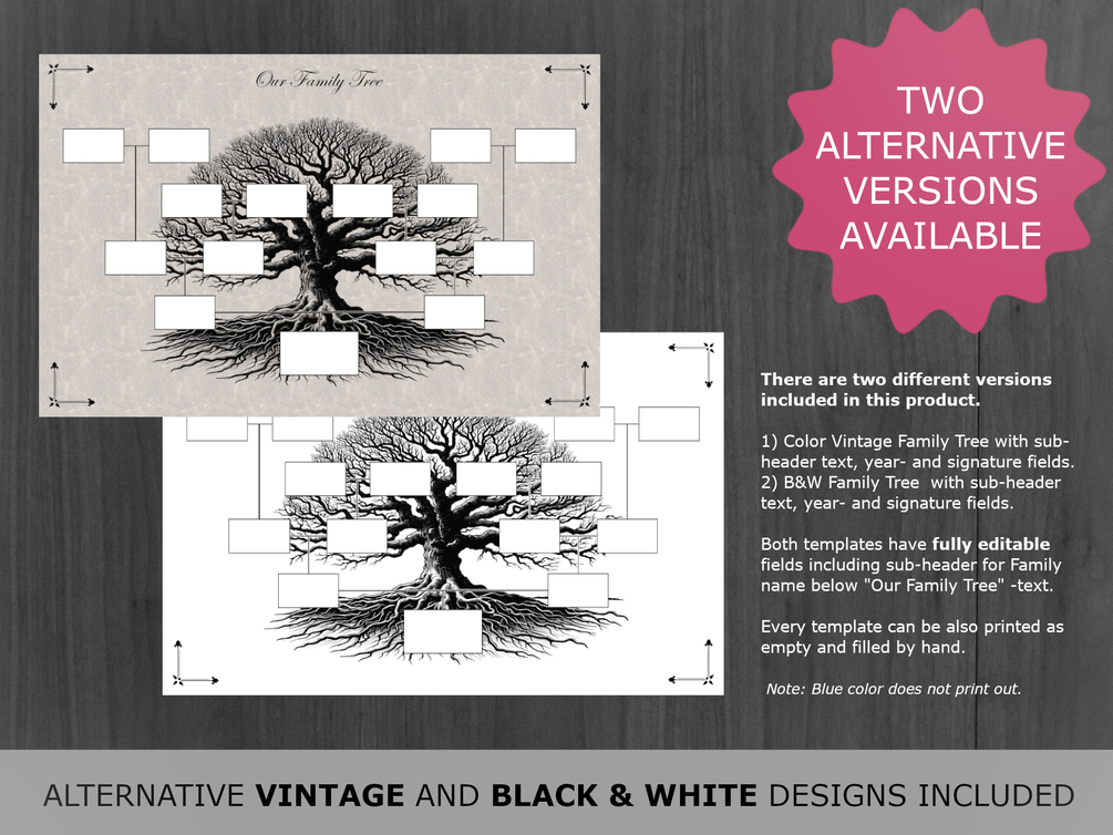 • 1 X Color Vintage Family Tree with sub-header text (under "Our Family Tree"-text"), year- and signature fields.