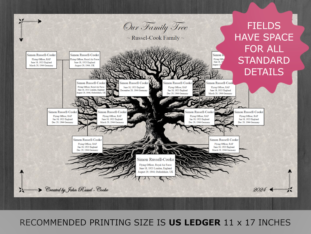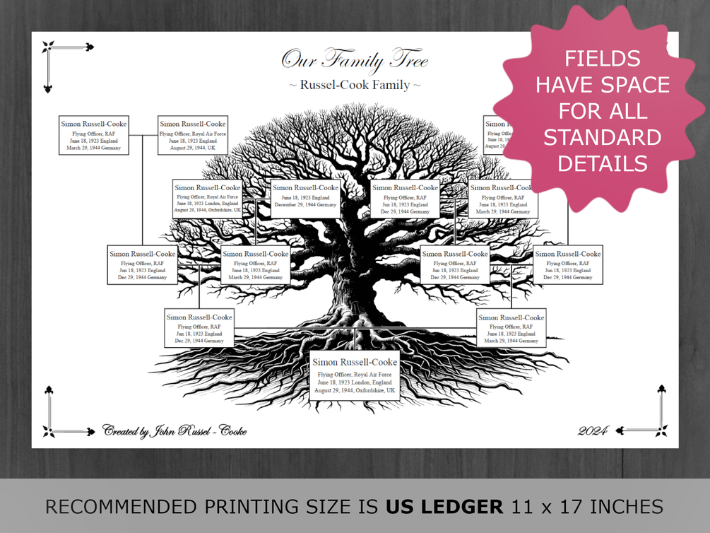 • 1 X Black & White Family Tree with sub-header text (under "Our Family Tree"-text"), year- and signature fields.