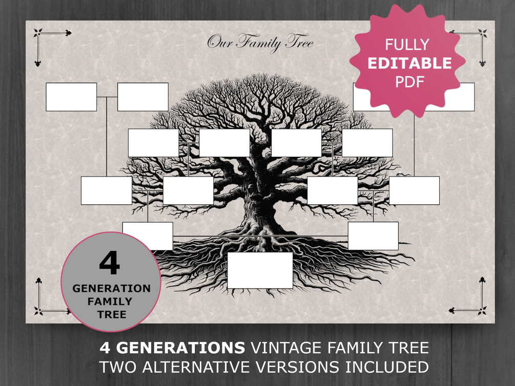 Vintage Family Tree Template for 4 Generations. Printable and Editable Family Tree. Genealogy Chart to be framed and hung on the wall.